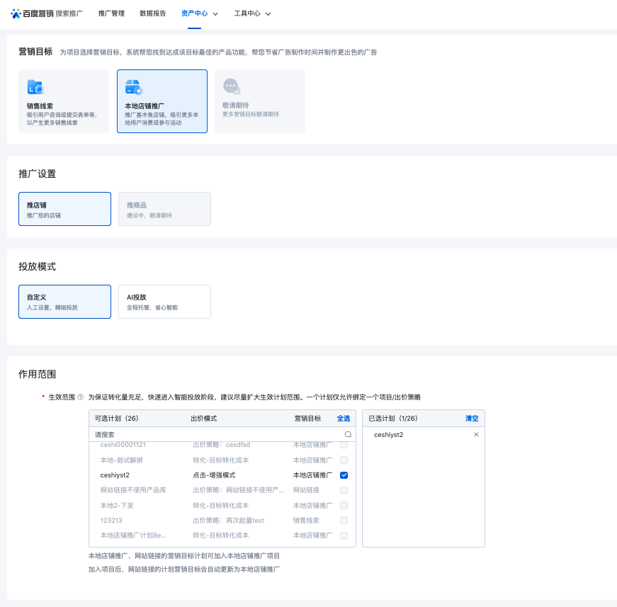 请注意,智投项目是oCPC出价策略的升级版本,计划加入智投项目后,“自定义”投放模式下的投放效果,和使用oCPC出价策略完全一致,但您可以在智投项目上进一步选用推广场景、开启“AI投放”等高级能力,实现更好的转化效果。后续搜索推广投放平台将继续智投项目的权益和能力,本次升级仅为投放平台智投项目新增「本地店铺推广」营销目标功能上线,不影响账户现有投放中的计划的正常投放效果。