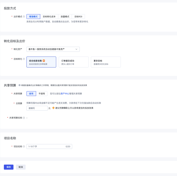 注意:一个计划仅支持绑定一个出价策略『提升转化』或『智投项目』
