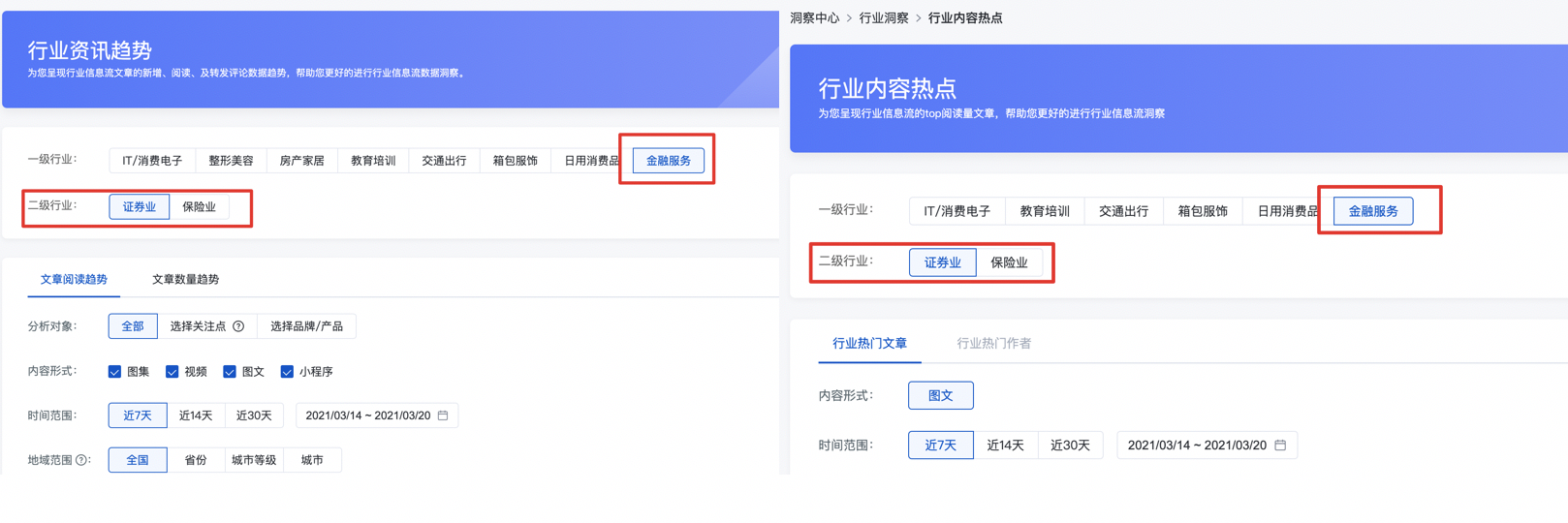 行业资讯趋势&行业内容热点洞察,可支持金融服务-保险、金融服务-证券业行业进行资讯数据分析,辅助用户进行行业营销策划。