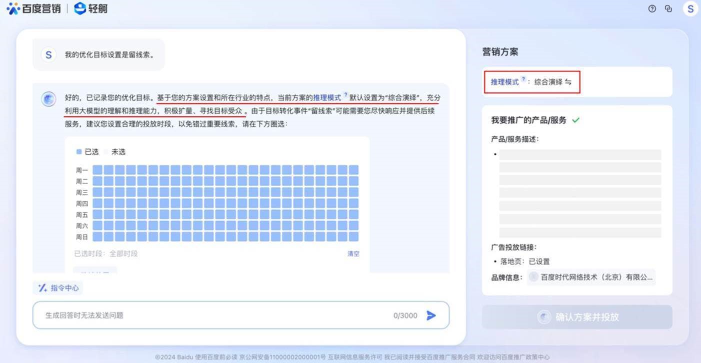 “放开说”、“简单做”、“都搞定”是轻舸营销平台的独家特色,广告主可以通过自然语言在营销方案中,充分地描述所要推广的产品和服务,以及希望重点让哪些目标人群看到广告。轻舸智能系统会基于生成式AI大语言模型的理解和推理结果,根据方案的描述寻找需要这些产品或服务的用户,并根据用户的个性化需求生成广告,实现最佳的投放效果。百度搜索作为国民搜索,每天涌现的用户搜索需求千变万化,因此轻舸广告投放和其他传统广告投放方式一样,需要不断对齐用户需求调整营销策略,以此实现效果的不断提升和良性循环。