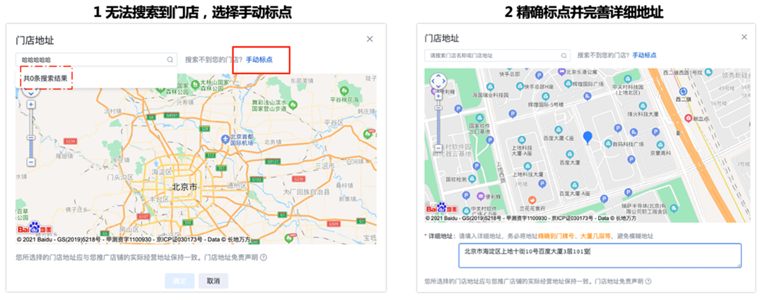 - 功能说明:当商家通过搜索地址找不到自己的门店时,可通过手动标点输入详细门店地址,来完成门店入驻