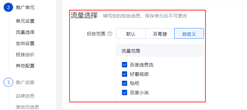 但针对定向【自定义】流量(如下图,自定义流量包含百度信息流,好看视频,贴吧和百度小说4种)的单元,因为数据报告和推广管理列表呈现数据的逻辑不同,会出现看起来不一致的情况,实际上数据是一致的。