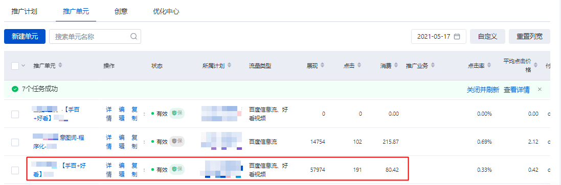 推广管理页面以推广单元维度呈现数据,因此会将单元定向的所有流量数据汇总为一条内容: