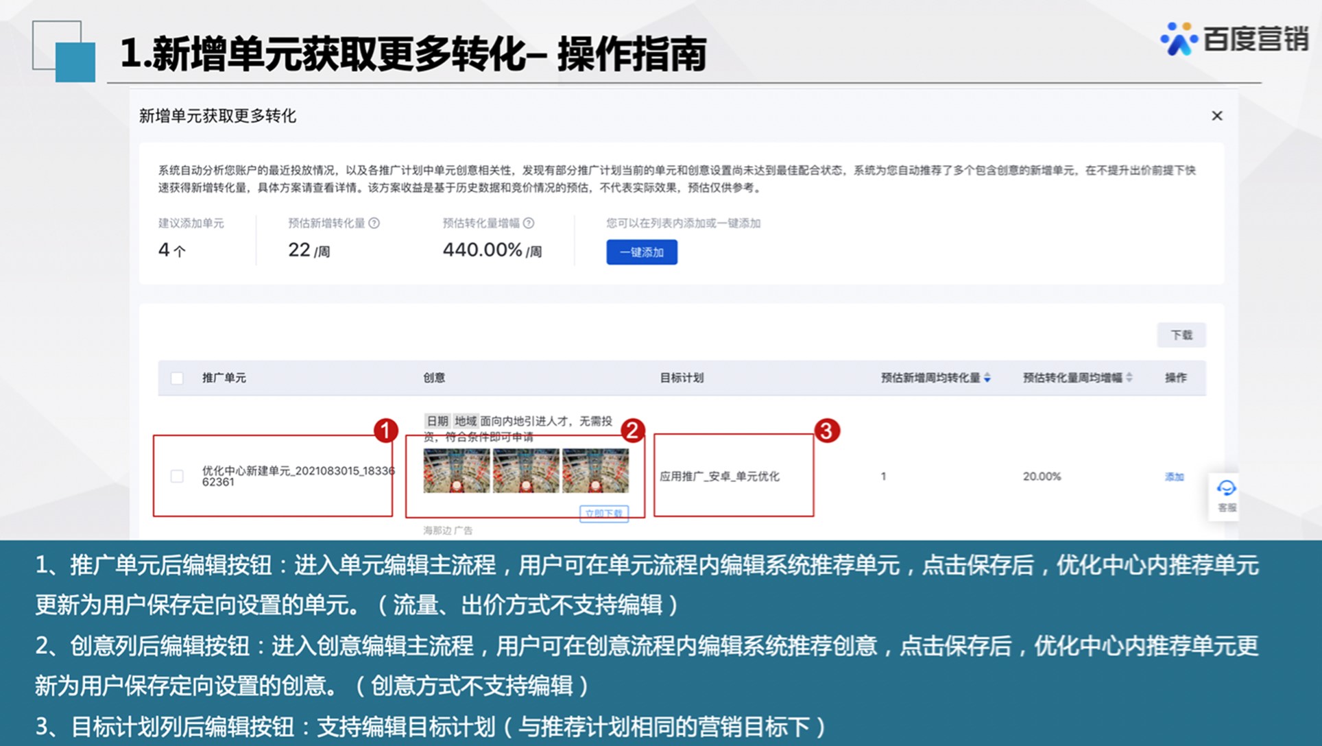 A3:新增单元获取更多转化卡片是新建单元、创意,不会修改您当前账户下任何物料,不会对其他单元、创意产生影响。系统自动分析您账户的最近投放情况,以及各推广计划中单元创意相关性,为您推荐单元和创意的最佳组合。