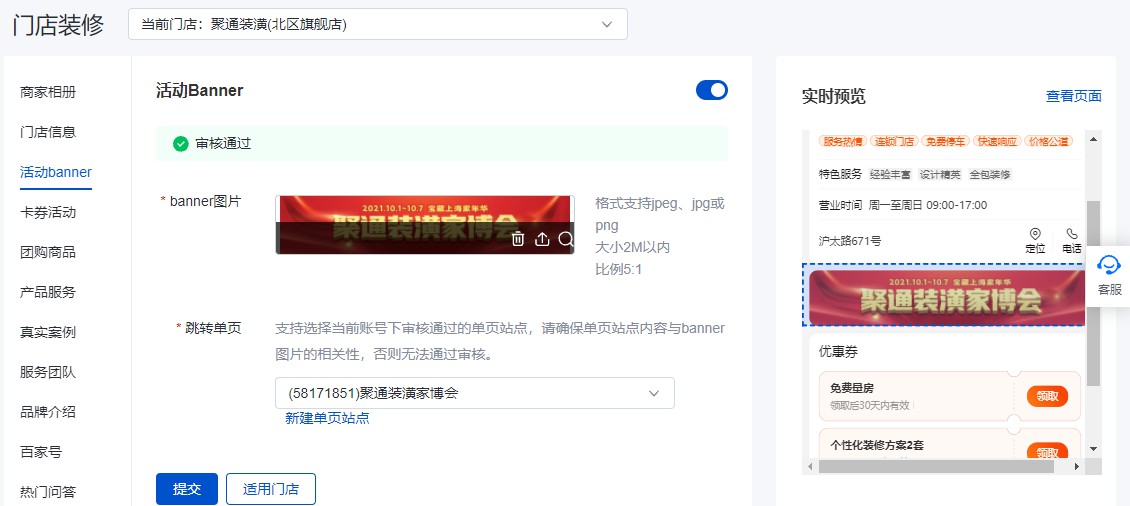 - 设置路径:我的门店-门店装修-活动banner,右侧可实时预览banner图片效果(如下图)