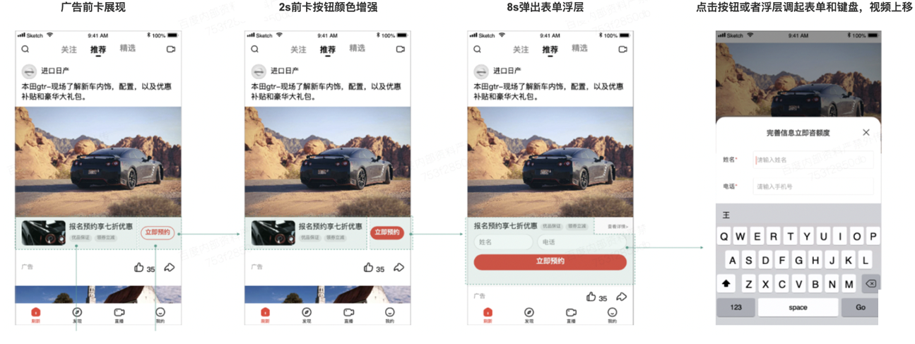 用户点击广告创意视频下方的【立即预约】按钮或灵动表单浮层→ 弹出半屏式表单面板 → 用户填写表单 → 提交成功 → 关闭表单页面继续停留在广告前卡。(重要!前置表单只能收集用户姓名和电话,不支持收集其他信息)