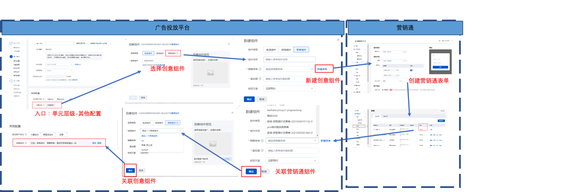 客户自主开通流程:广告主可在信息流广告投放平台单元层级-其它配置(创意组件)中,按照如下流程,创建并关联表单组件