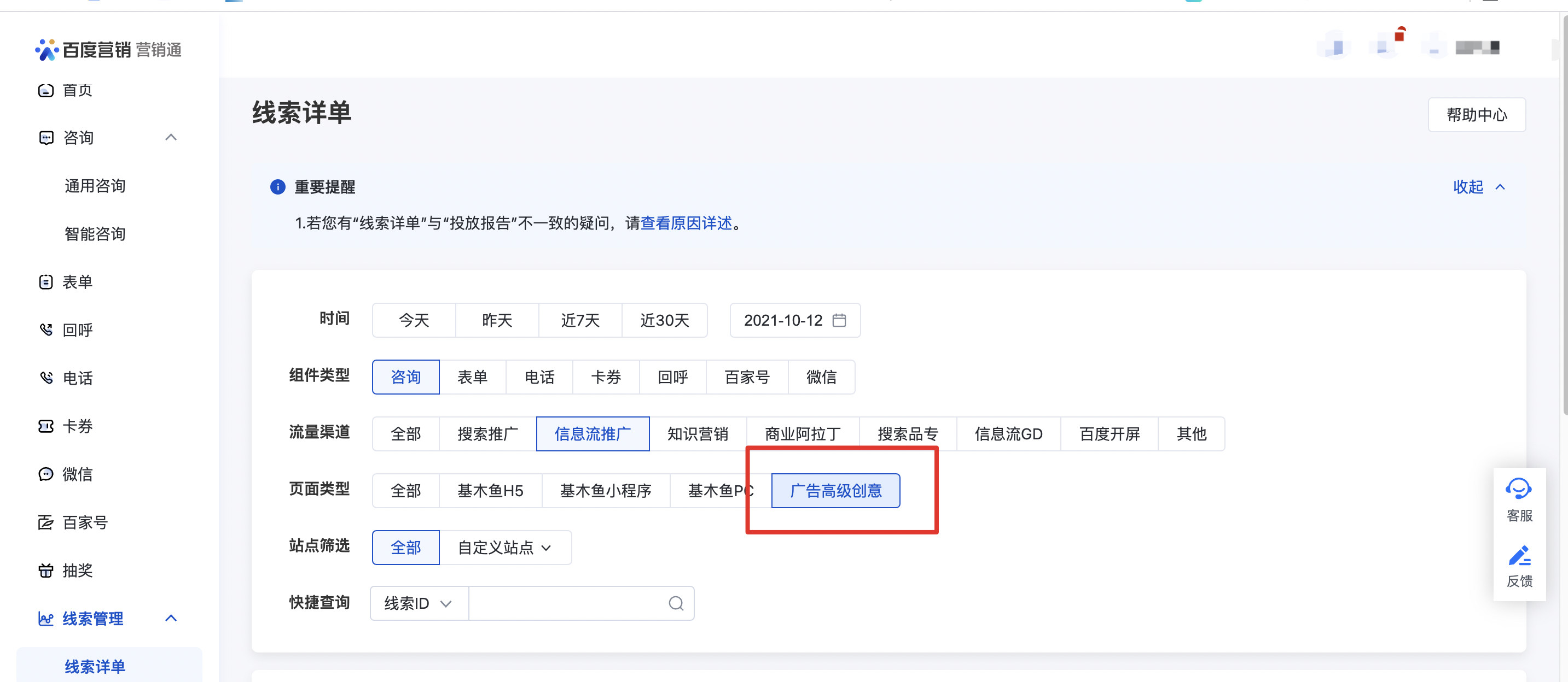视频前卡表单带来的线索会沉淀在营销通,客户在营销通后台-线索详单中选择“广告高级创意”查看前置表单留下的线索(示意图如下)