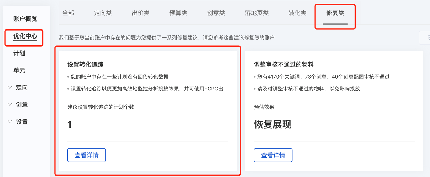百度搜索推广-“优化中心”新增oCPC投放相关建议
