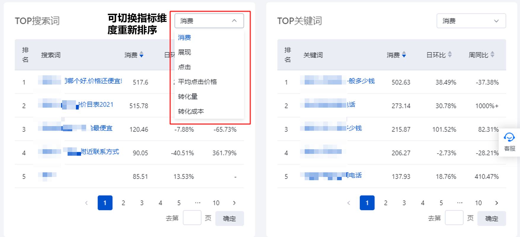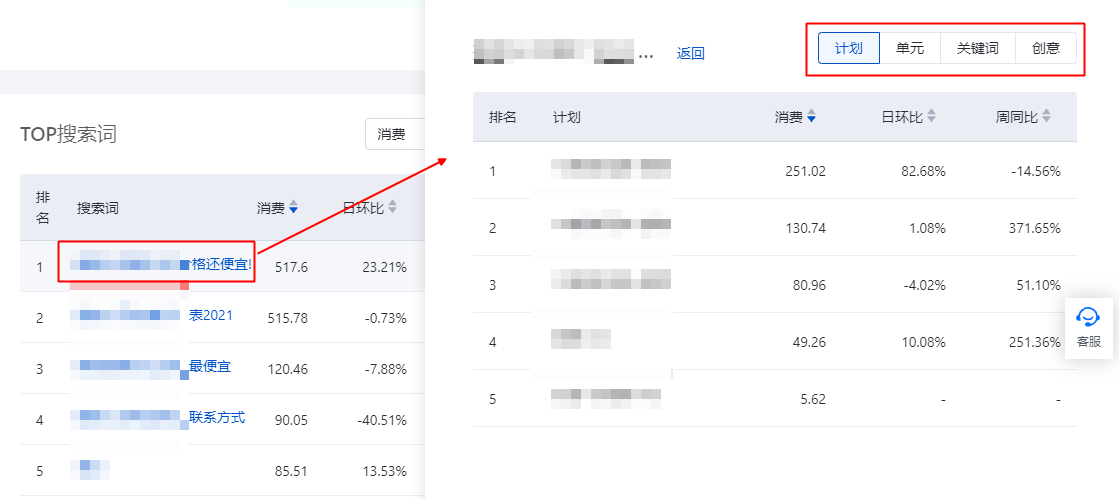 点击具体搜索词,可调取该搜索词所属计划等信息(TOP关键词同理):