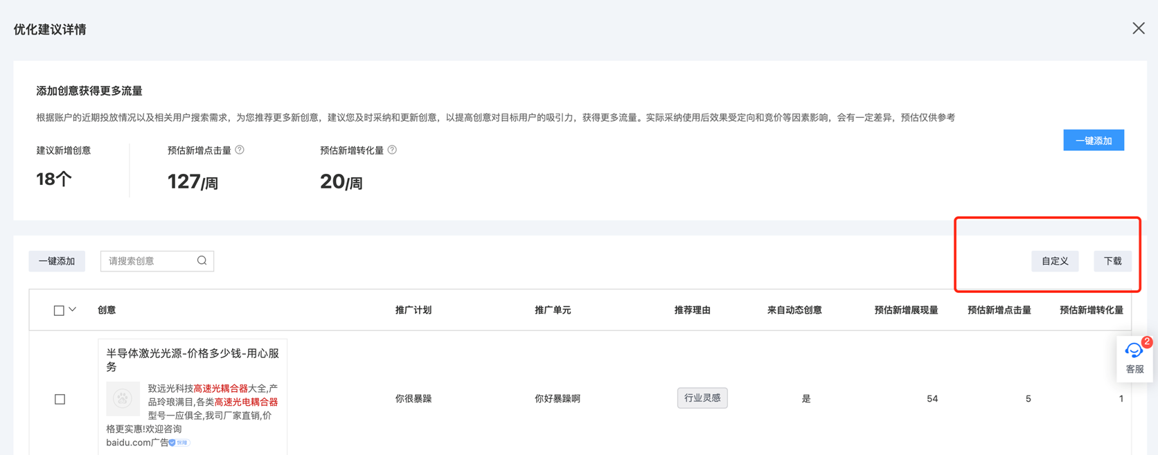 为更好地帮助客户撰写优质创意,获取更多流量,提升投放效果,『优化中心』创意推荐能力本次进行升级,原有的“添加创意提升点击率”建议更名为“添加创意获得更多流量”,丰富推荐的信息,为每个新创意增加推荐理由,提供“预估每周新增点击量”与“预估每周新增转化量”等收益指标,帮助客户决策采纳。