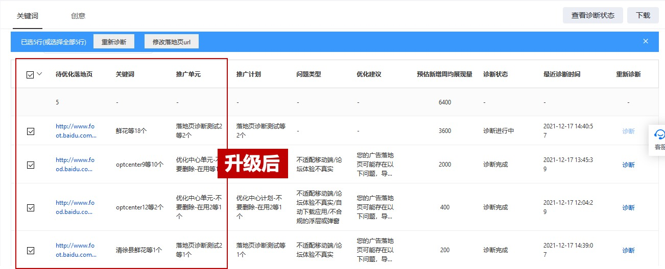 1)简化诊断状态为【诊断完成】、【诊断进行中】和【诊断失败】三种,且【诊断状态】支持筛选,广告主可以快速筛选出“诊断失败”的落地页重新发起诊断,也可以查看哪些落地页已经“诊断完成”。