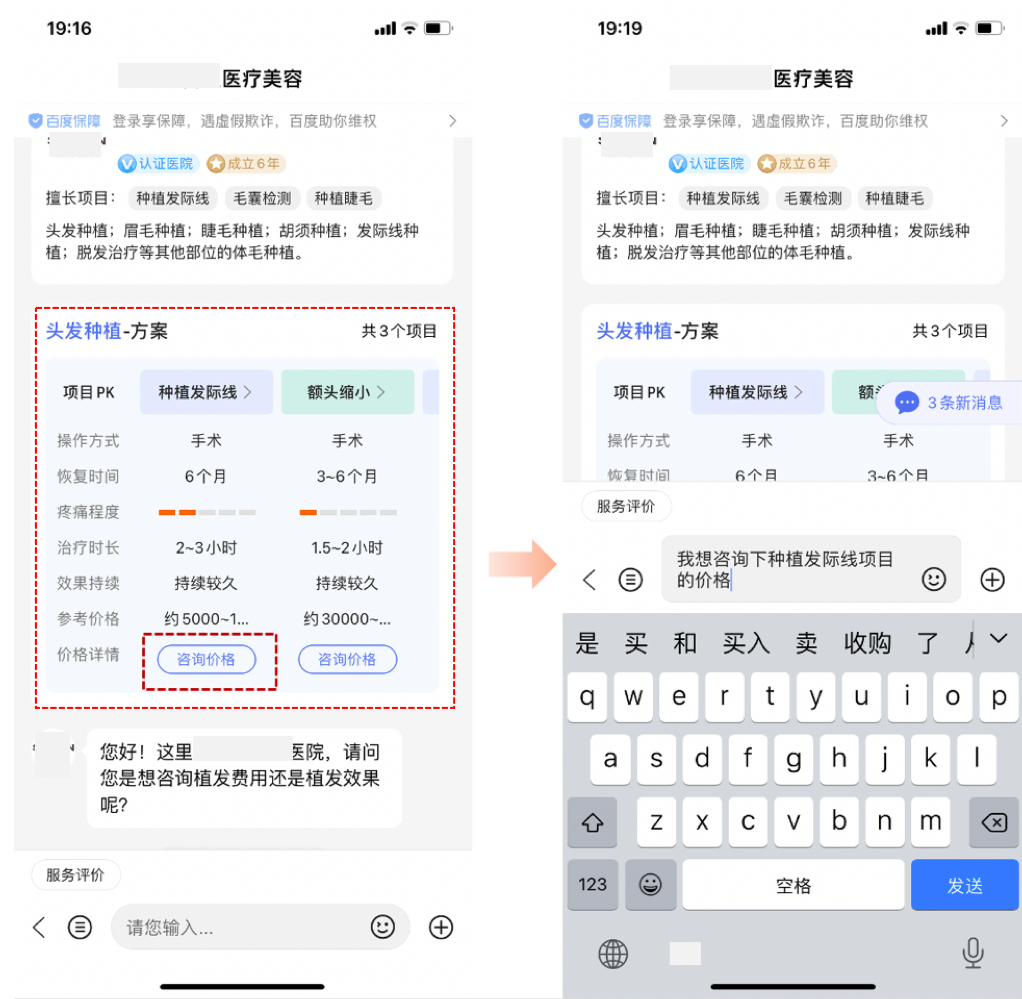 1)网民点击“咨询价格”,调起键盘在输入框中预输入“我想咨询下XXX项目的价格”,用户点击“发送”为一条消息;