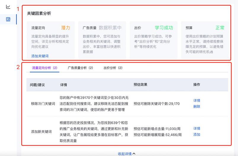 关键因素是指影响广告投放规模和效果的重点因素,系统会从流量定向、广告质量、出价、预算四个关键方向进行洞察分析;