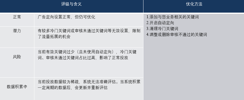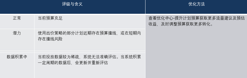 1)系统根据您出价策略所绑定计划的设置及当前投放情况,对“流量定向、广告质量、预算”等关键因素进行“风险、潜力、正常”评级,对“出价”进行学习状态披露,帮助您及时了解当前投放情况;