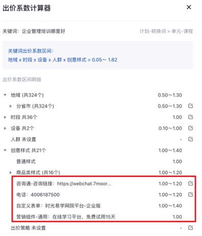 3、搜索推广投放平台(www2.baidu.com)-出价系数计算器中将不再展示营销类组件的出价系数(见下图示意)