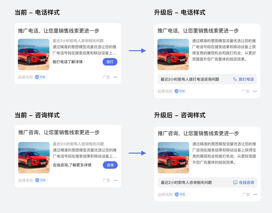 为规范搜索广告创意展现规则,建立用户对广告创意的长期心智,稳定用户对创意中转化(电话&咨询)功能预期,搜索推广创意样式将于2022年8月31日进行升级,对“电话”和“咨询”的创意组件在搜索结果页的呈现形态和布局顺序进行优化,提升搜索广告整体用户体验和客户的投放获客效果。