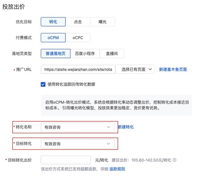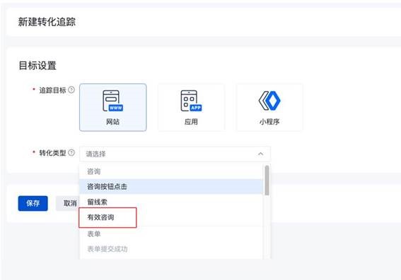新建转化追踪:转化类型新增【有效咨询】选项,不再提供【一句话咨询】和【三句话咨询】选项,历史设置的转化追踪暂不支持修改转化类型,当客户使用的推广URL是含咨询转化组件的基木鱼页面时,可在单元直接选择目标转化为【有效咨询】,无需新建转化追踪。