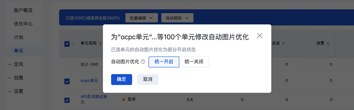 A:本次升级后,新建单元「自动图片优化」开关默认开启,可手动关闭,且支持批量操作。存量单元的「自动图片优化」开关状态则遵循广告主的账户设置与升级前的单元「自动配图」开关状态保持一致。