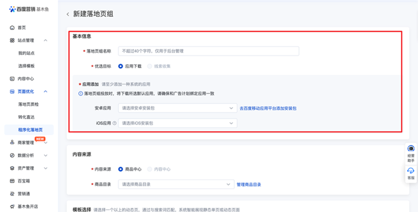 2、基本信息:输入落地页组名称、优选目标(目前仅支持下载),选择投放包
