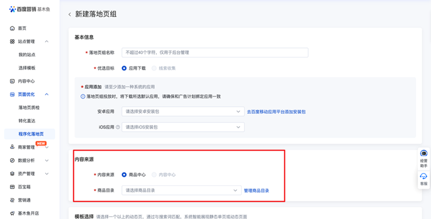 3、内容来源:目前仅支持BMC商品中心,选择对应商品目录,对应目录内容即为动态页面内容来源