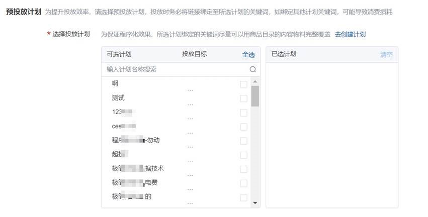 4、投放计划:勾选对应落地页组预备投放的计划,在配置时选择要投放的计划,可以缩短策略模型计算时间,使广告动态策略尽快生效