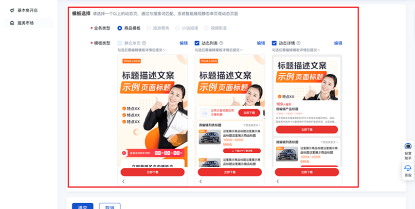 5、选择模板:勾选对应的业务类型和模板,静态页必选1,目前支持动态商品列表单列,动态商品详情页两种动态模板