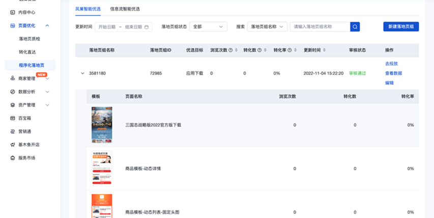 7、数据观察:投放后,可以在落地页组列表中实时查看到各模板的展现、转化情况