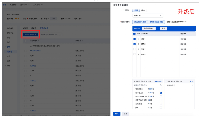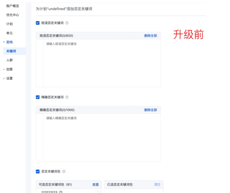 3、更清晰的否词管理入口:关键词层级新增否定关键词列表,展示账户下所有计划及单元上设置的否词和否定关键词包,并统计账户下否词的总量级及匹配类型,便于优化师统一查看效果并按需进行精细化控制。