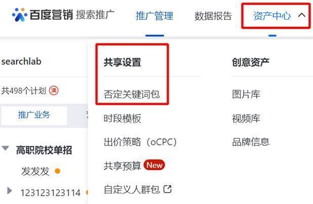 产品入口:资产中心 -> 共享设置 -> 否定关键词包