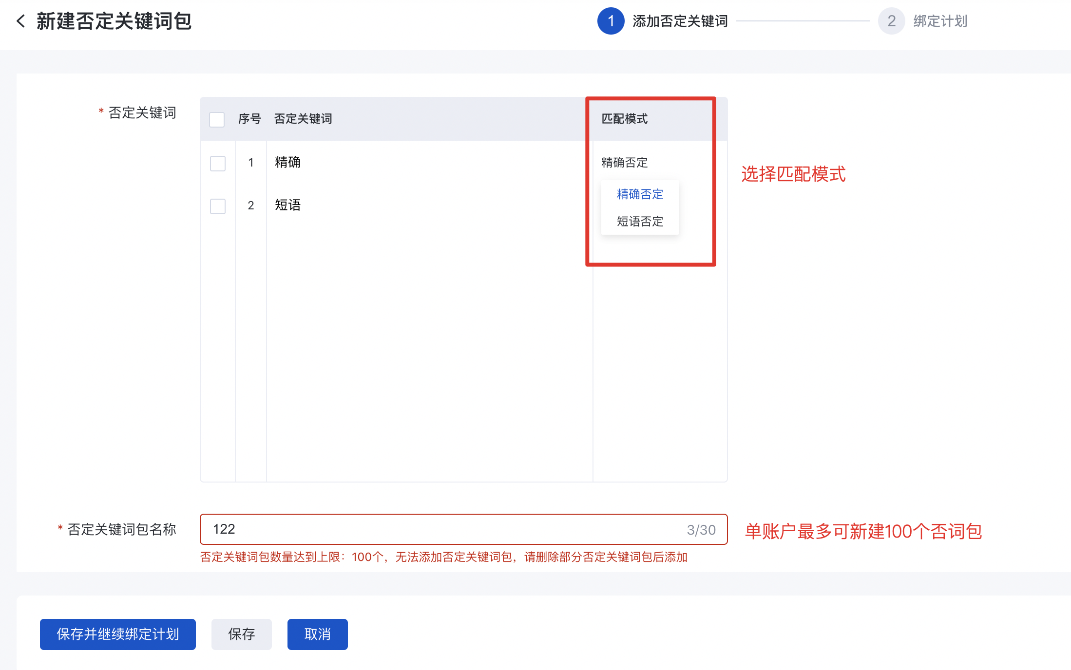 - 新建/编辑否定关键词包内否词时,在"匹配模式"栏选择精确否定或短语否定,新建否词包后可直接将该词包绑定至计划;