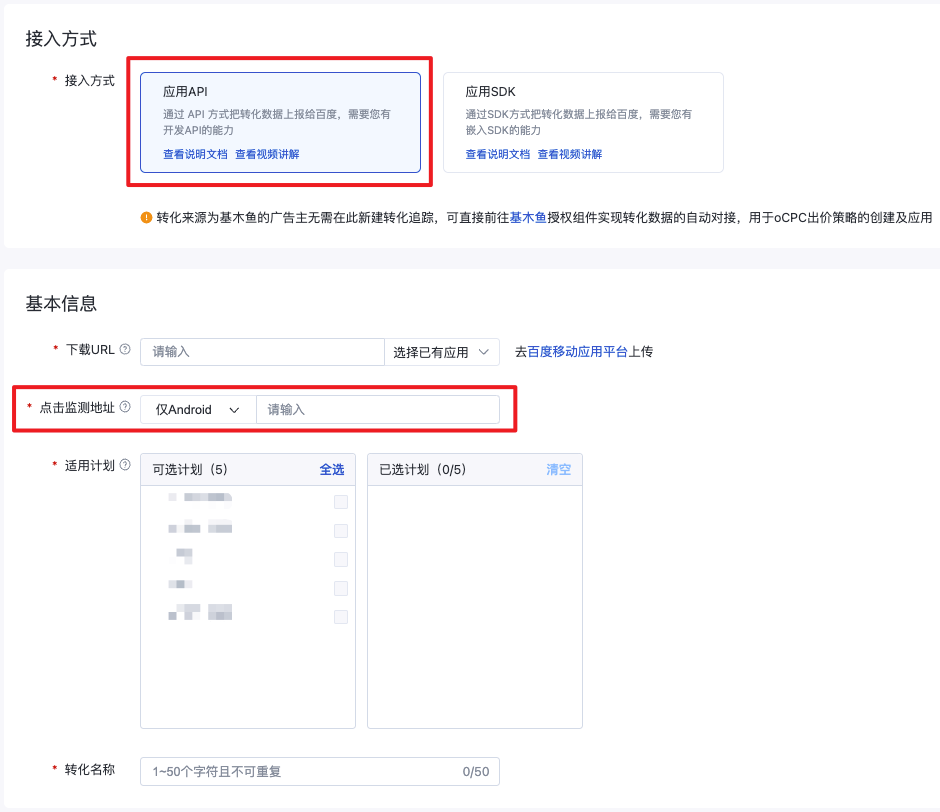 搜索推广-->转化追踪-->新建/编辑转化追踪-->接入方式为应用API-->点击监测地址