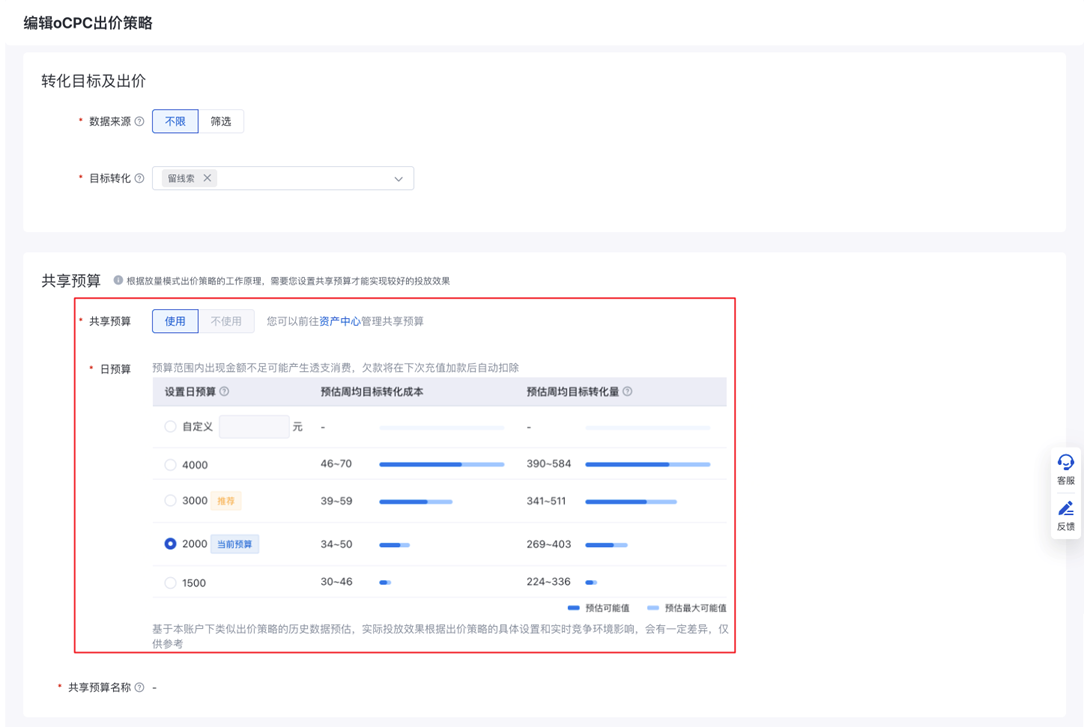 2.“放量模式出价策略”提供不同预算设置档位下预估转化量的洞察,帮助优化师合理进行共享预算设置决策