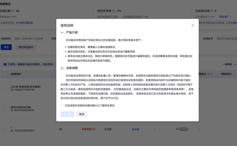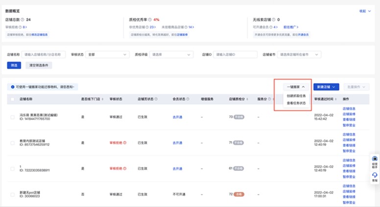 - 教育或家装类目店铺,在店铺-店铺管理,展示【一键搬家】按钮