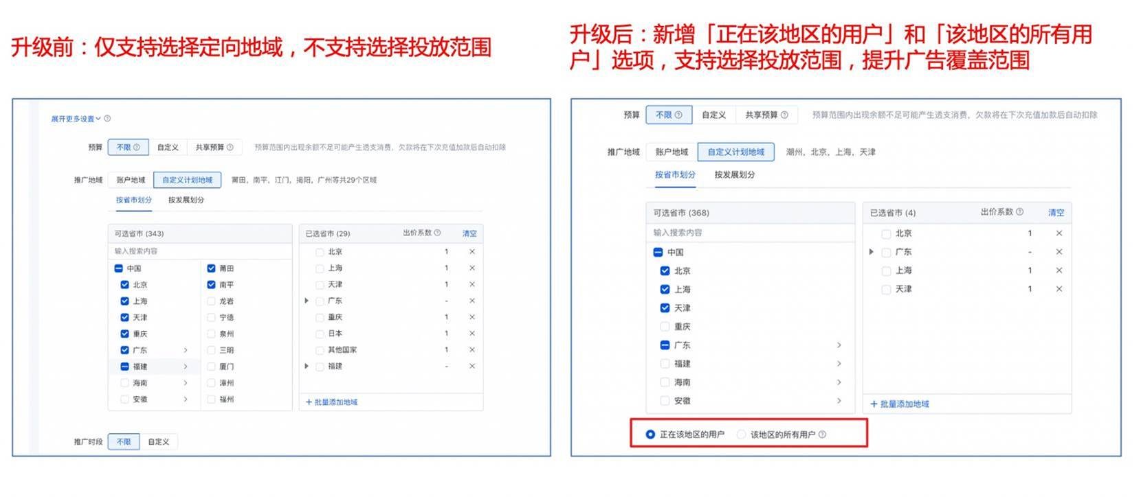 本次升级后,客户可以自行选择投放人群范围,同时将简化地理位置定向表达以提升广告效果。