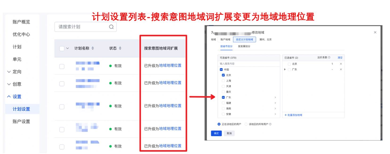 3、账户/计划层级搜索意图地域扩展开关下线,变更为地理位置选项