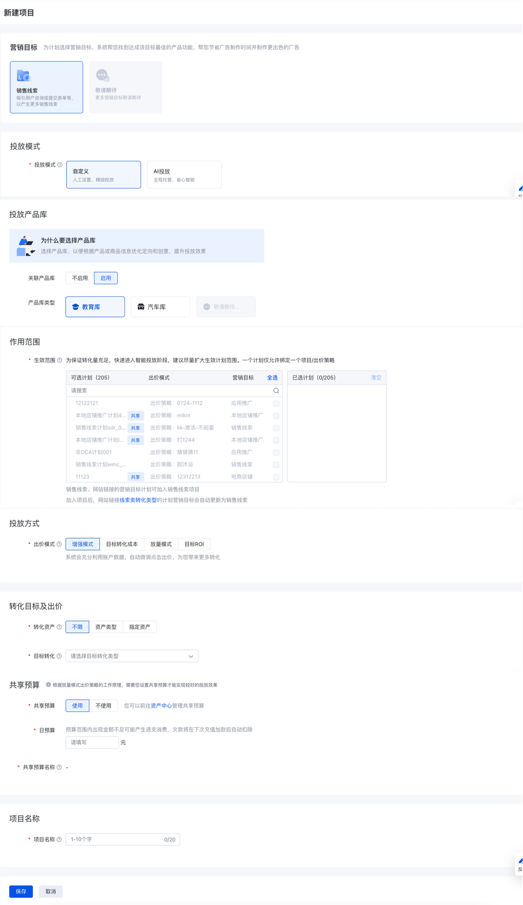 当前新建仅支持选择营销目标『销售线索』项目,更多营销目标上线敬请期待。