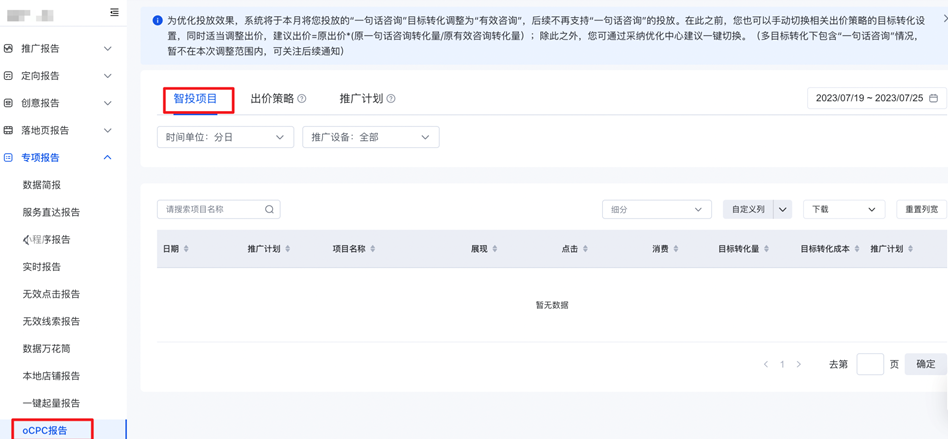 查询路径:数据报告->专项报告->oCPC报告->智投项目