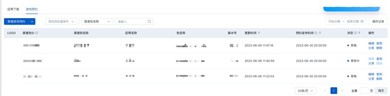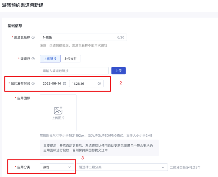 新建:点击新建游戏预约按钮,进入新建页面,在下载渠道包的填写字段基础上增加预约发布时间填写(必填)