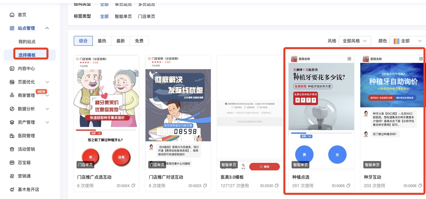 1、入口:【基木鱼】→【站点管理】→【选择模板】→「点选互动」与「对话互动」落地页;