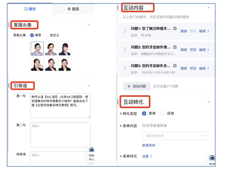 - 【对话互动】-- 支持设置「客服头像、引导语、互动内容与互动转化」
