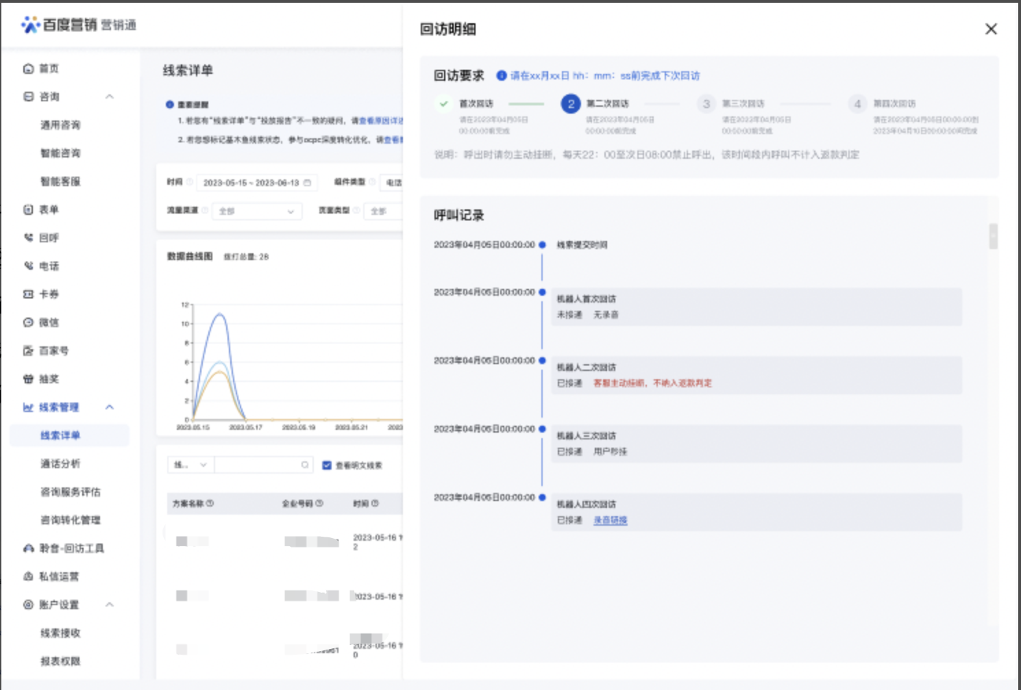 5)如何查看聆音回访录音:进入营销通线索详单——>找到回访状态列,点击查看回访详情——>找到对应通话,点击录音链接