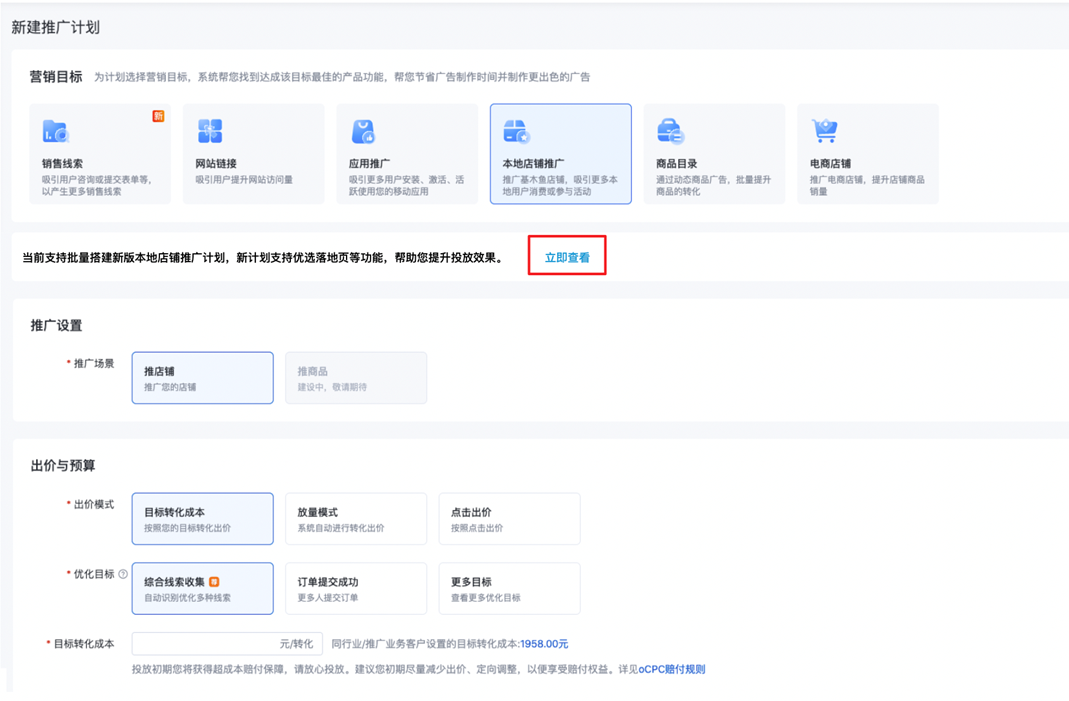 登录搜索推广平台-新建推广计划-营销目标(本地店铺推广)