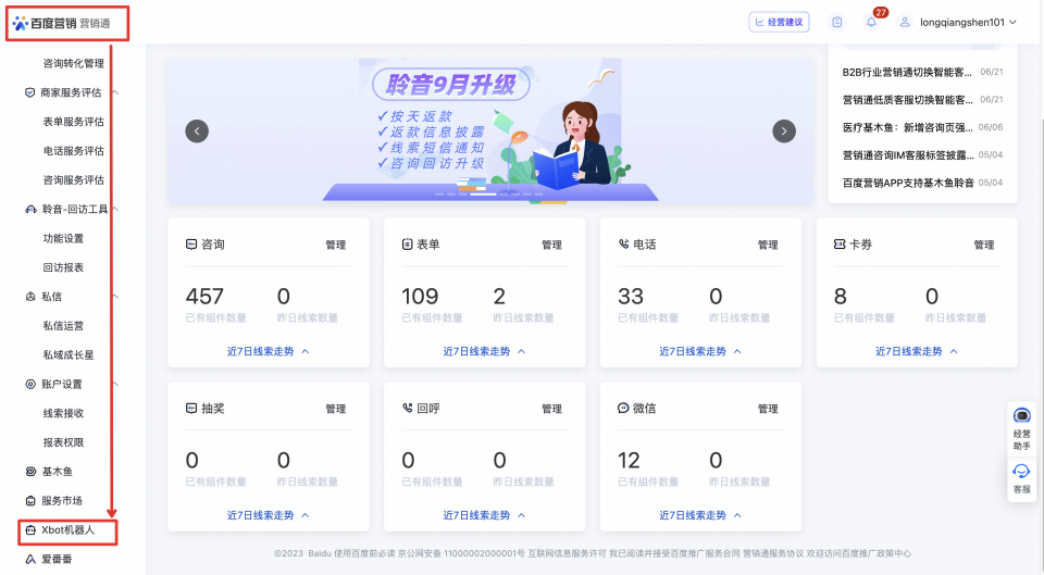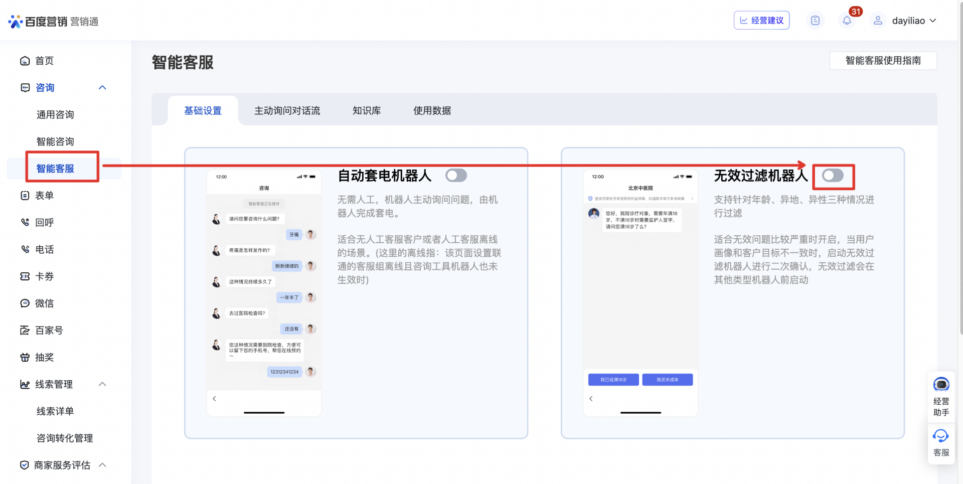 第一步:进入营销通平台,点击「智能客服」,打开无效过滤机器人按钮,开始配置;