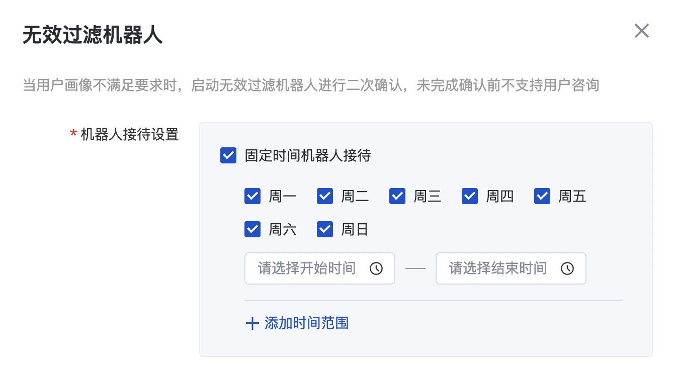 退出机制:申请使用的客户若想退出,可自行在「营销通-智能客服-无效过滤机器人」关闭无效过滤机器人