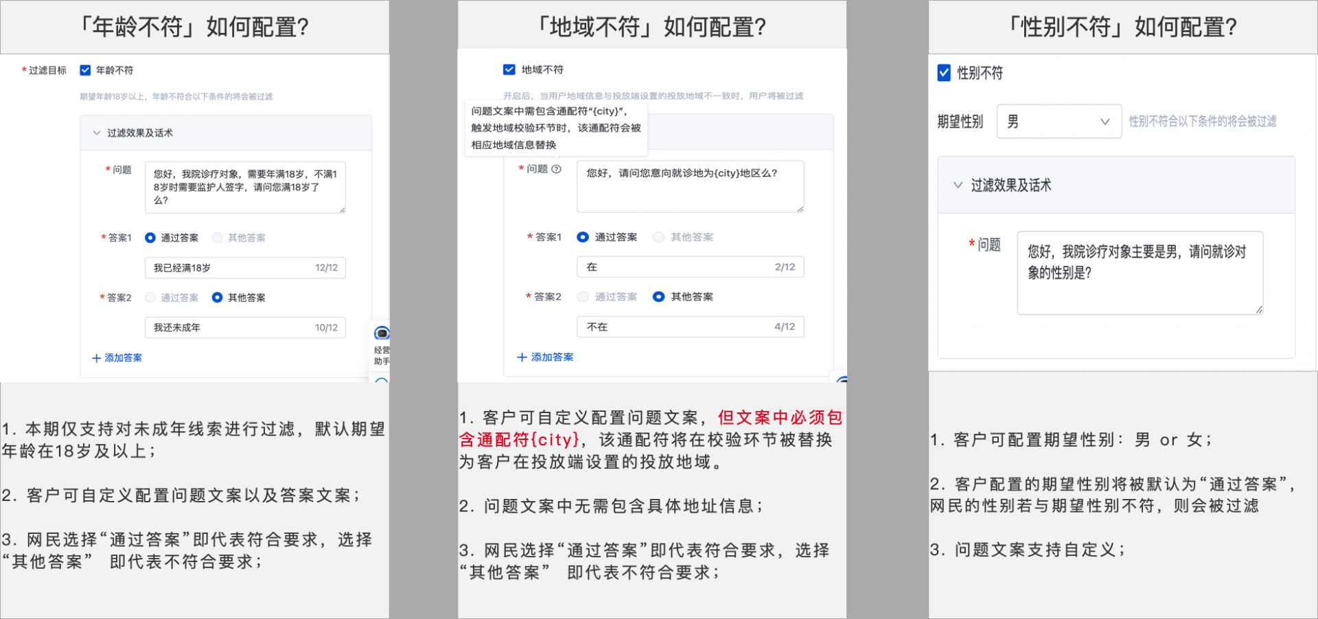 针对大健康行业客户所反馈的线索无效性问题,结合无效线索的高频类型(异地、未成年、异性),通过无效过滤机器人对线索进行验证、过滤、标记,优化客户投放效果,提升咨询接待效率。