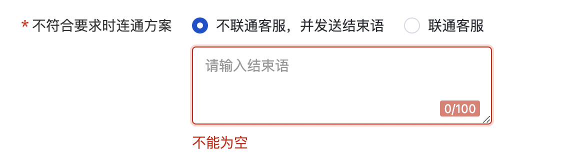 - 若选择“不联通客服,并发送结束语”,必须设置结束语,在无效过滤校验环节中若网民不符合要求,机器人将自动发送结束语,会话结束;