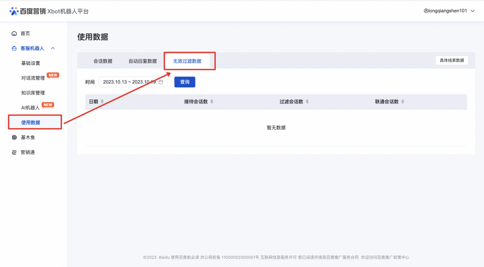 进入营销通——Xbot机器人平台——使用数据——无效过滤数据,可选择时间进行查询