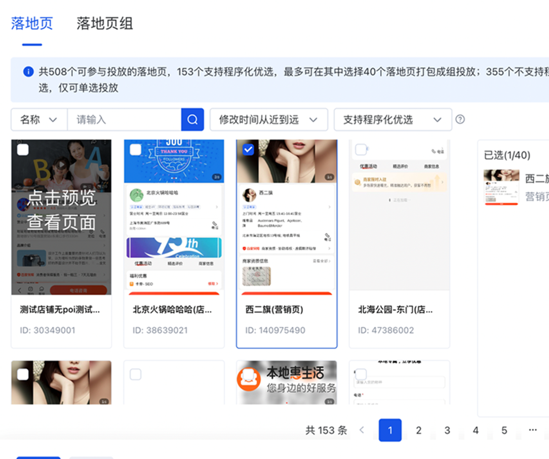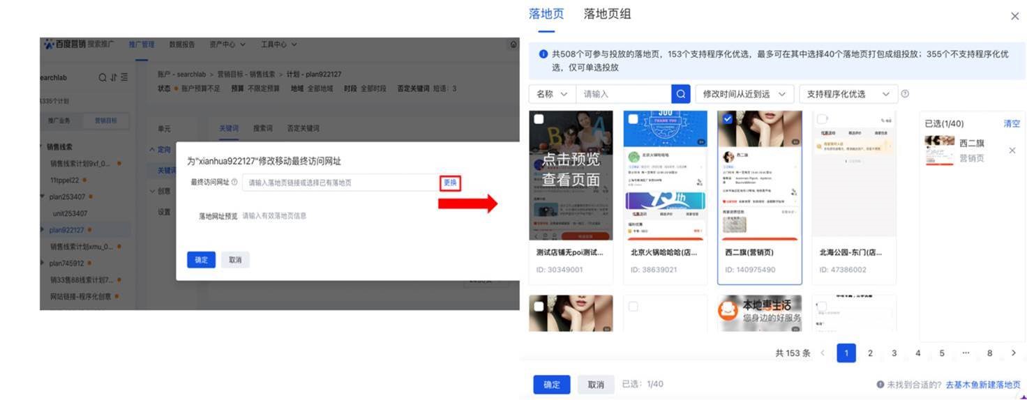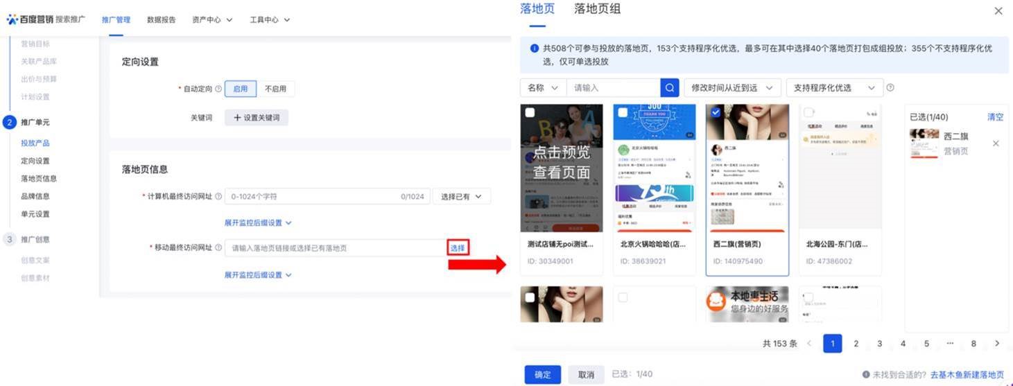 - 在搜索广告平台勾选的营销页会展示在「营销页选择」模块内,并支持新增选取或删减