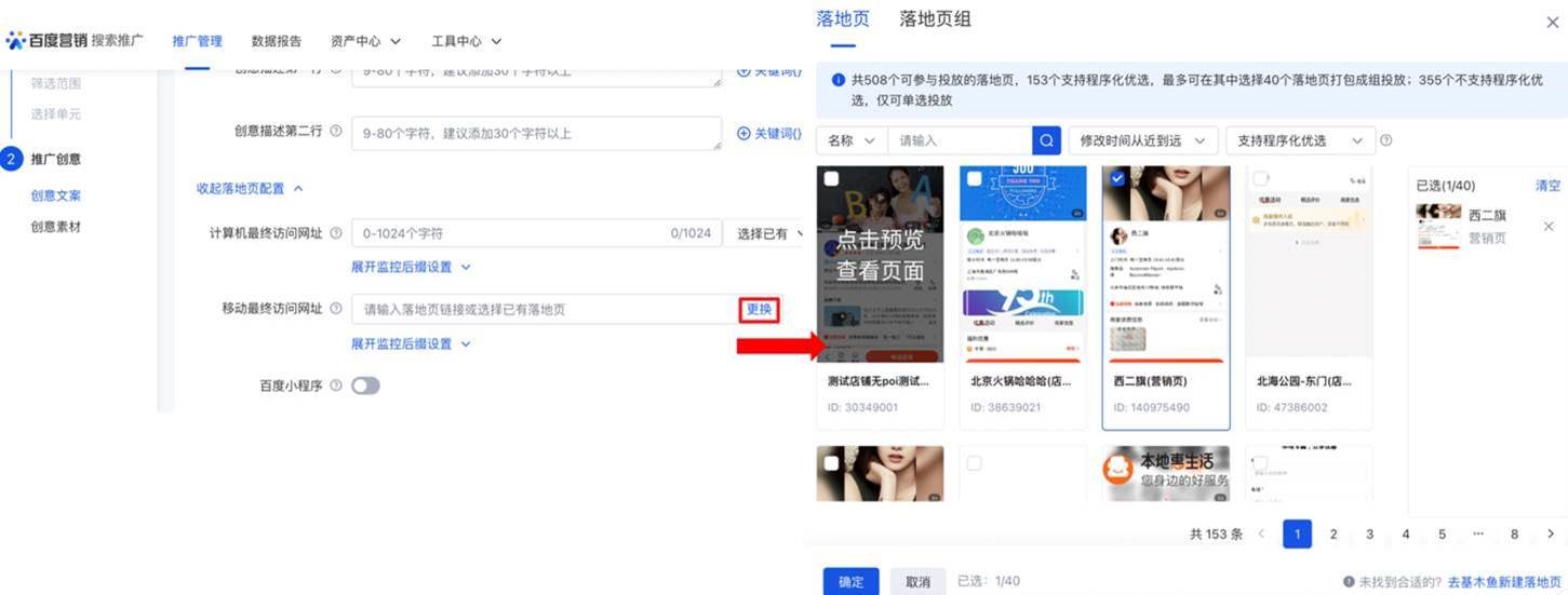在「移动最终访问网址」中点击「选择」/「更换」,即可选择基木鱼落地页和程序化落地页组。如下图所示: